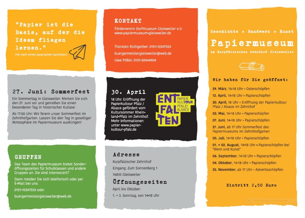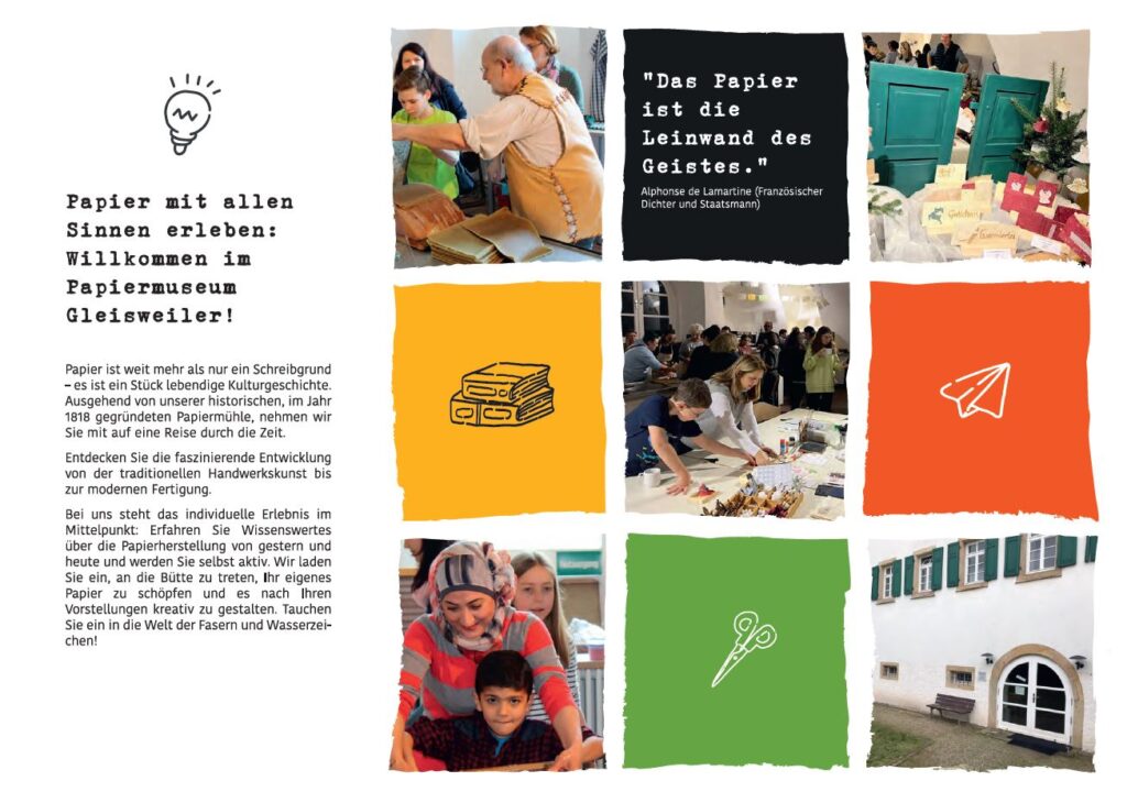 Der Förderverein Dorfmuseum Gleisweiler e.V. hat nach Abschluss einer sorgfältigen Renovierung und Restaurierung im Juni 2006 das Papiermuseum unter dem Motto „Faszination Papier – Geschichte + Handwerk + Kunst” eröffnet.
